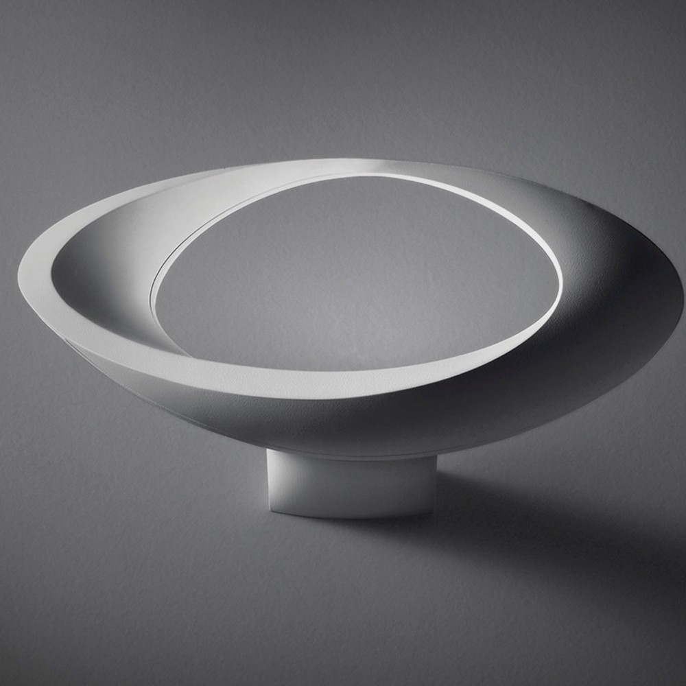 La luz indirecta modela el cuerpo de la lámpara, realzando su forma sinuosa y otorgándole un aspecto sorprendente de anillo luminoso.