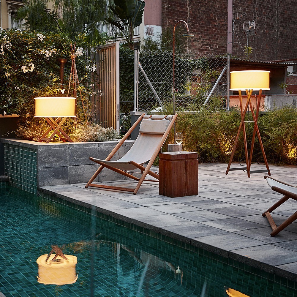 Crear un ambiente confortable y cálido de interior en un espacio de exterior. Este es el objetivo de Cala, una lámpara con fuerte carga decorativa y cuya estructura bebe de la sencillez de las mesas metálicas de bar o los clásicos caballetes de pintor.