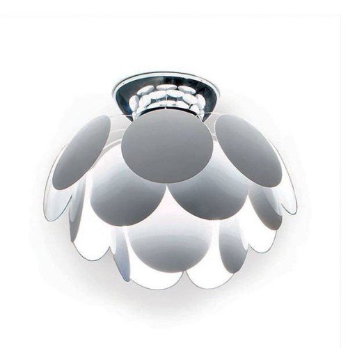Su detallado estudio de la luz incidente y rebotada en ambas caras de los discos que la componen, da una atractiva graduación de matices lumínicos y profundidad a la pieza. La semiesfera cromada del núcleo, donde se anclan los discos, aporta reflejos suplementarios. Apagada la lámpara preserva su atractiva presencia, sugiriendo esa expansión de energía que cobra todo el sentido al utilizarla.