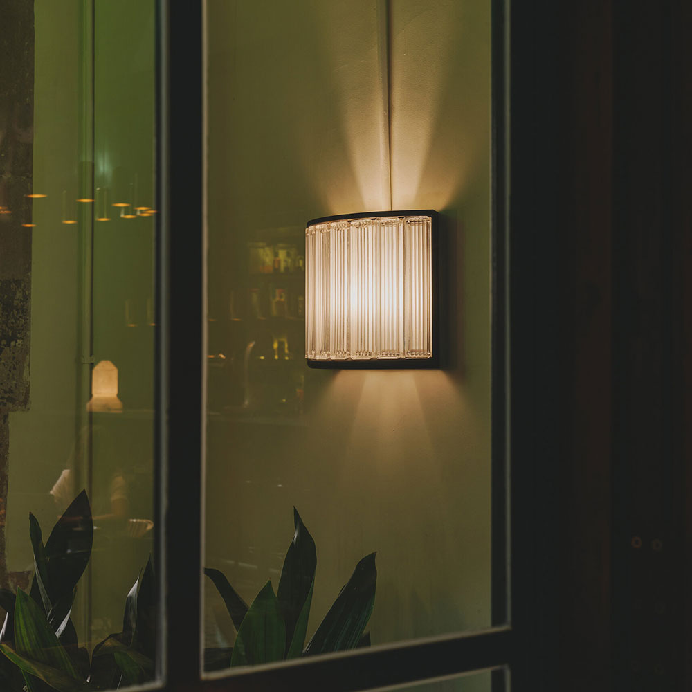 La estructura tubular del armazón sostiene unas pantallas de vidrio pavés que dispersan el haz luminoso mediante estriaciones verticales de luces y sombras. La familia Estadio, con diversos diámetros de suspensión, se completa con la Línea Estadio (de estructura recta, enlazable en secuencia una tras otra) y este aplique Estadio.