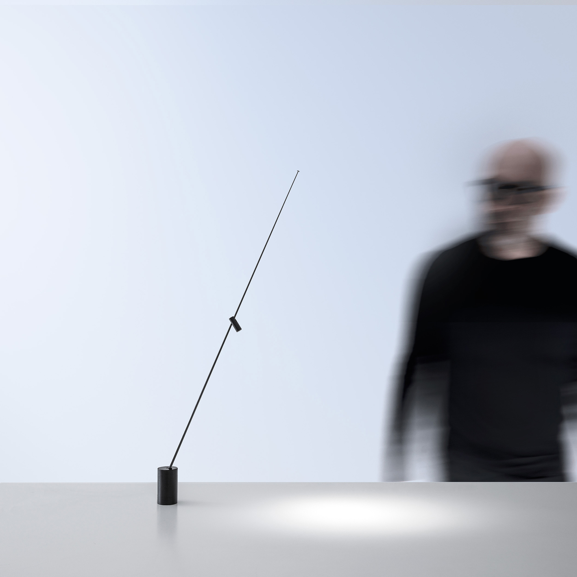FM es una lámpara de mesa con luz directa para uso en interiores. Una «antena» de luz. Las antenas son misteriosas, absolutas e intrínsecamente bellas, ya que su esencialidad no expresa más que su función. La base es de aluminio anodizado en negro mate. El brazo es de fibra de vidrio en negro mate y se puede inclinar. El foco es de aluminio anodizado en negro mate y se puede orientar en una dirección.
