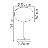 Lámpara de sobremesa de luz difusa. Difusor compuesto por un cristal soplado opalino tratado al ácido y una virola con rosca en aleación de aluminio fundición a presión, con acabado galvánico cromado. Base en acero de gran espesor, pie en tubo de acero y soporte del difusor en aleación de aluminio fundido a presión, todos ellos pintados en color gris. El dimmer electrónico que está en el cable consiente la regulación gradual de la intensidad luminosa