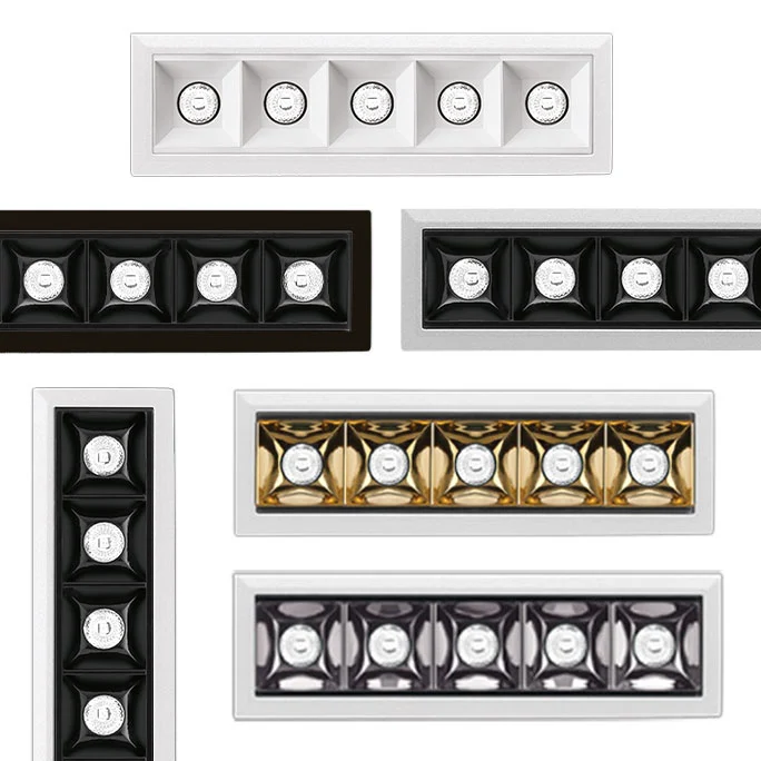 Versiones con marco perimetral (frame) y a ras de techo (minimal); disponibles modelos con un LED y con celdas múltiples.