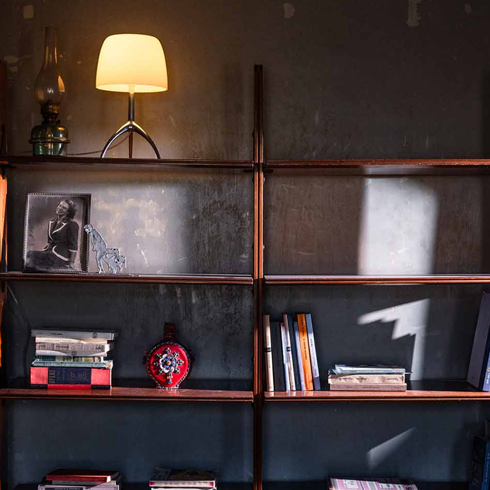 Lámpara de mesa de luz directa y difusa. Difusor en vidrio encamisado con acabado brillante, soplado a boca, blanco en el interior y de color en el exterior. En las versiones turquesa, cerezo y blanco cálido el vidrio dispone de una segunda capa de vidrio en la parte interna en una tonalidad “pajiza”, amarillo pálido (un total de 5 capas de vidrio). Con el interior “pajizo”, la versión de color “blanco cálido” resulta de un color marfil cuando está encendida y se queda blanca cuando está apagada. En las versiones cereza y turquesa este doble encamisado hace que la luz sea más cálida y el color más intenso. Base tipo trípode en vaciado a presión de aluminio acabada y abrillantada a mano en la versión aluminio, pintada con líquido en la versión cromo negro o champagne; pies en silicona resistente al rayado. Interruptor on/off en el cable transparente con dimmer que permite una regulación gradual.