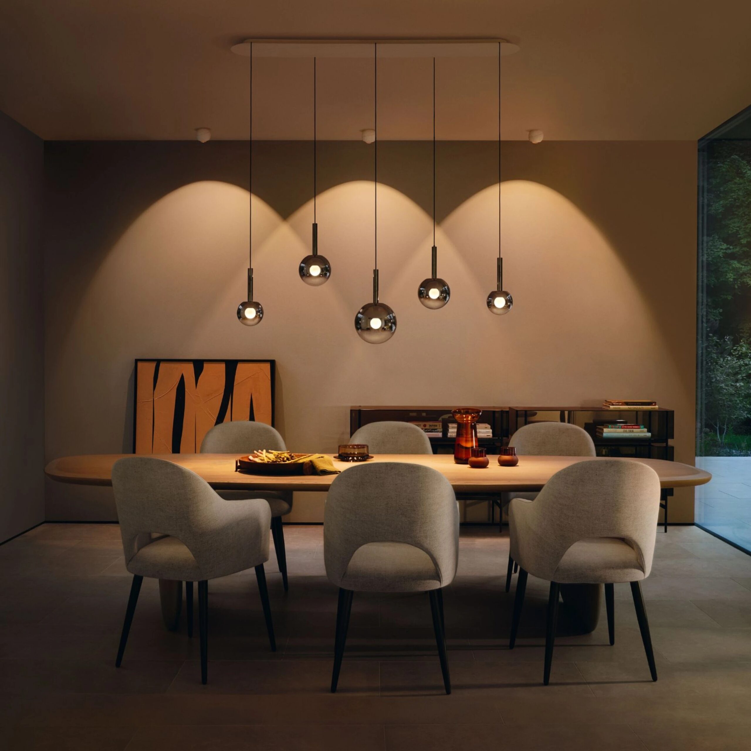 Sumergir cada estancia en una belleza sensual y misteriosa con la nube lineal Luna de cinco luminarias. Las luminarias crean una luz suave y dirigida que es a la vez potente y sin deslumbramientos. Su magia única tiene un efecto especialmente impresionante cuando las luminarias se colocan sobre mesas más grandes y alargadas.