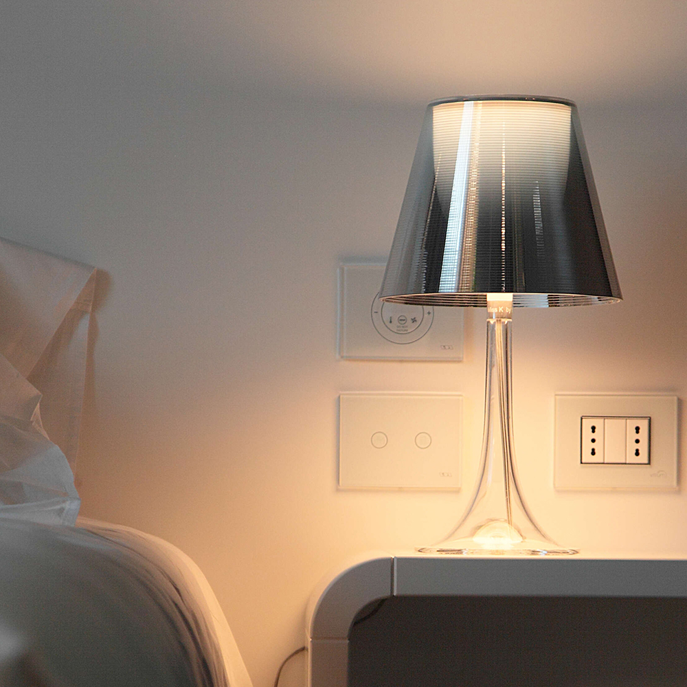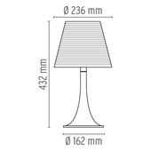 Lámpara de sobremesa de luz difusa. Chasis de PMMA (polimetilmetacrilato) totalmente transparente, moldeado por inyectado; difusor interno de PC (policarbonato) opalino moldeado por inyectado y difusor externo de PC (policarbonato) moldeado por inyectado aluminado – por la superficie entera- mediante procesamiento de aluminado en vacío al interior