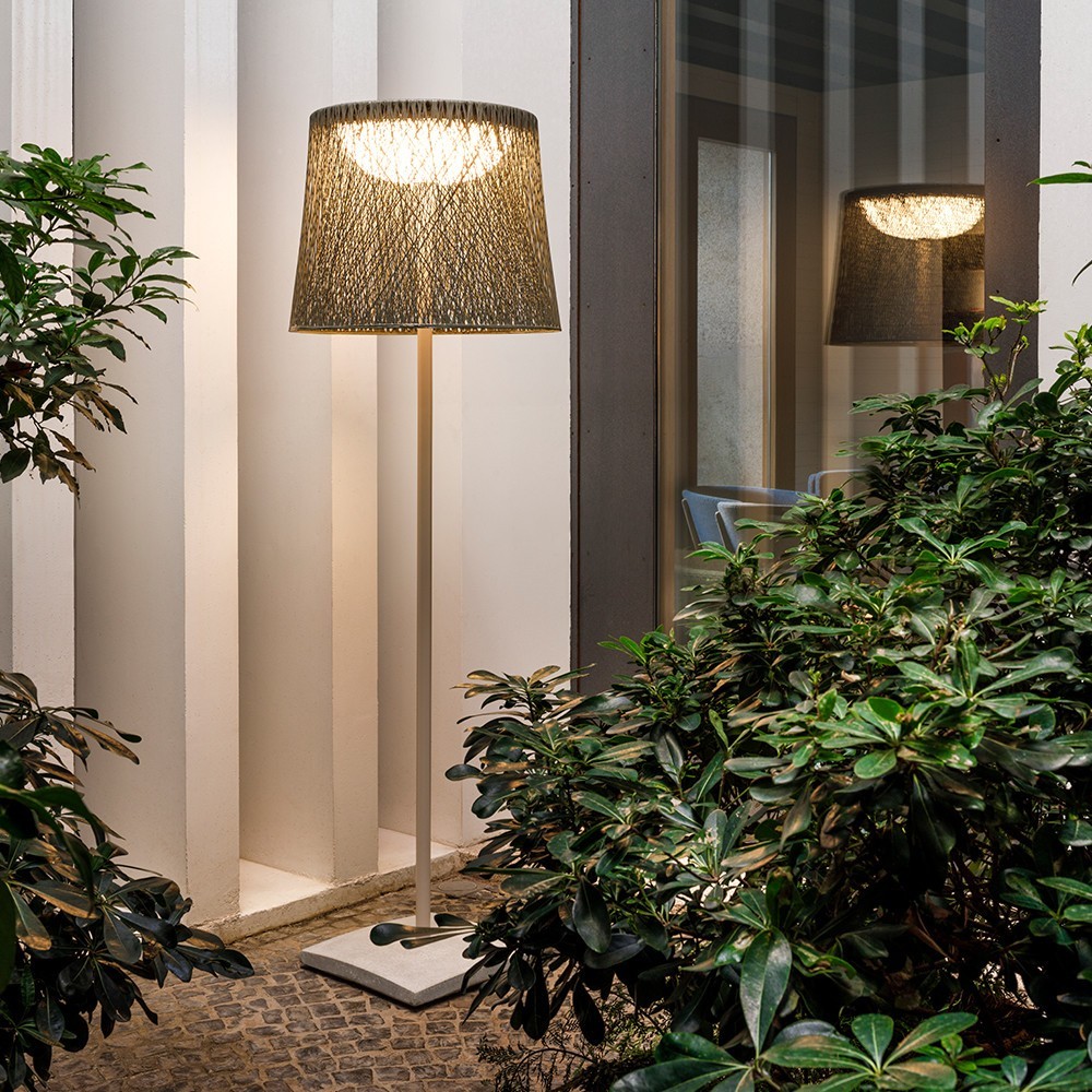 Lámpra de pie para uso exterior. Diseñada por Jordi Vilardell está disponible en verde, naranja, blanco y negro. La elección de un material, la fibra de vidrio, de transformación industrial, mediante un innovador uso de la tecnología filament winding, consigue dotar a esta colección de una estética que une tecnología y tradición.