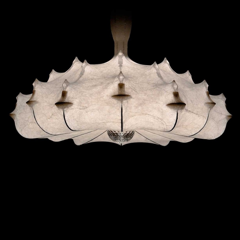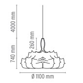 Lámpara colgante de luz difusa. Estructura interior en acero pintado en polvo blanco. Pantalla en resina «cocoon” pulverizada sobre la estructura, con película protectora transparente pulverizada al final. «Candelas” en polimetilmetacrilato (PMMA) transparente. Bola de cristal tallado para un efecto de luz centelleante, colocada en el centro de la parte inferior del aparato.